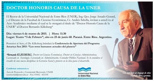 La Universidad Nacional de Entre Ríos otorgó el título de Doctor Honoris Causa a Bernardo Kliksberg. El acto se realizó el viernes 6 de marzo, a las 11:30, en el teatro Tres de Febrero de Paraná e invitaron al mismo el rector de UNER, Jorge Gerard, y el decano de la Facultad de Ciencias Económicas, Andrés Sabella.